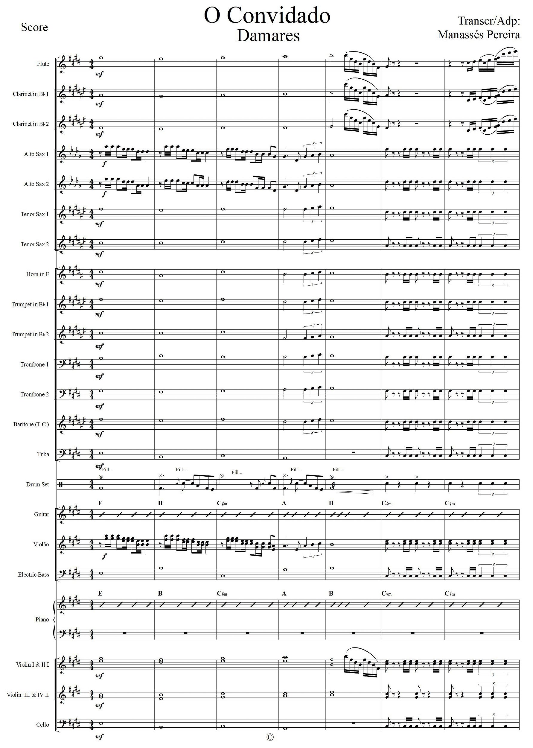 Flauta, Clarinetes, Sax Alto, Sax Tenor, Trompa, Trompetes, Trombones, Base e Violinos